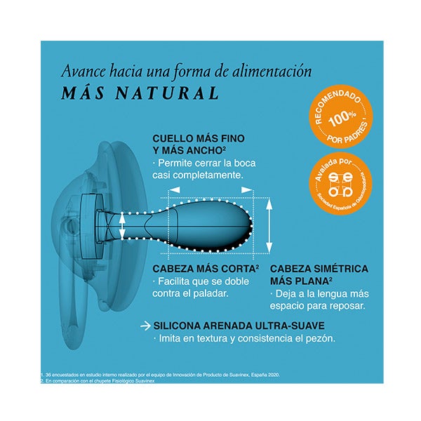 - Silicona fina ultra-suave con textura arenada: Reproduce la sensación del pezón materno por su calidez y alta flexibilidad, adaptándose perfectamente al paladar del bebé.
