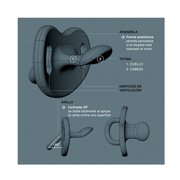 - Silicona extrafina y ultrasuave con acabado arenado: Reproduce la textura del pezón materno, ofreciendo una sensación cálida y un movimiento extremadamente flexible que se adapta al paladar del niño.