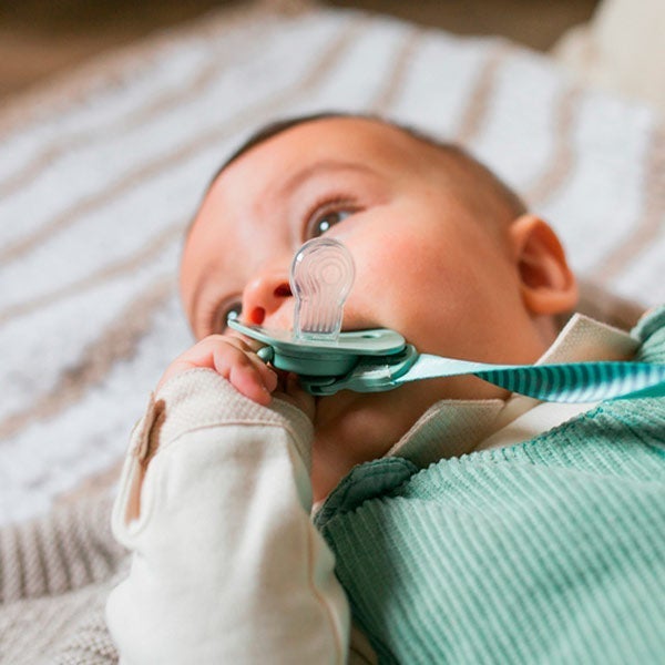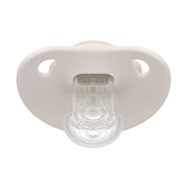 Chupete premium con tetina fisiológica de silicona, con diseño plano y simétrico que garantiza una colocación adecuada en la boquita del bebé, ayudando a reducir la presión sobre el paladar.