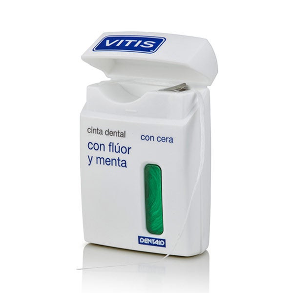 VITIS cinta dental con flúor y menta posee un diseño plano y fino que ofrece una amplia zona de contacto para retirar a fondo el biofilm acumulado entre los dientes.