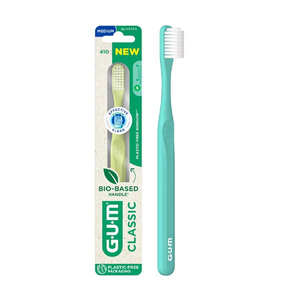 El cepillo dental Classic Medio de la marca GUM ha sido creado para mantener una completa higiene bucodental. Gracias a sus filamentos Dome-Trim, garantiza una limpieza eficaz incluso bajo la línea gingival, zona propensa a la acumulación de placa. Su mango, elaborado con material 100% de origen biológico, ofrece una sujeción ergonómica y confortable. Además, el cepillo viene en un empaque libre de plástico, ayudando a disminuir los residuos y fomentando hábitos de cuidado oral más responsables con el medio ambiente.