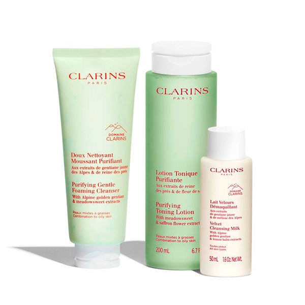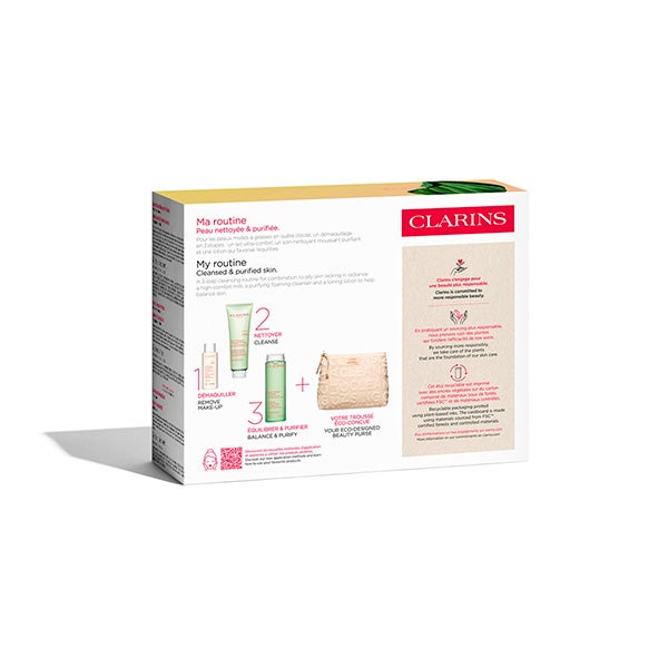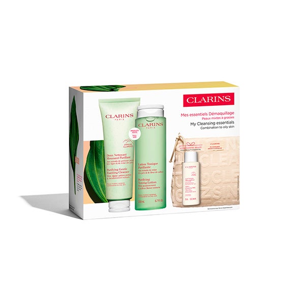 Empaquetado en un neceser Clarins exclusivo, este set ofrece un ritual completo que deja la piel purificada, equilibrada y con un aspecto luminoso.