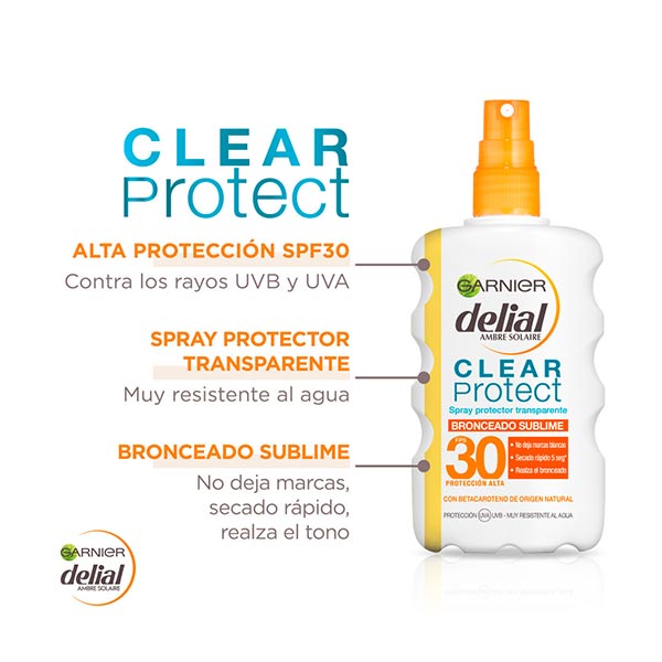 Delial Clear Protect Spray IP30 Ideal Bronze es un protector solar en spray transparente que potencia el tono bronceado.