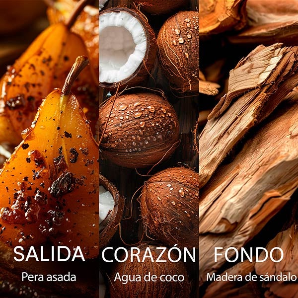 Su composición gira en torno al dulce y envolvente aroma del agua de coco, realzado por delicadas notas de pera asada y el toque cálido del sándalo.