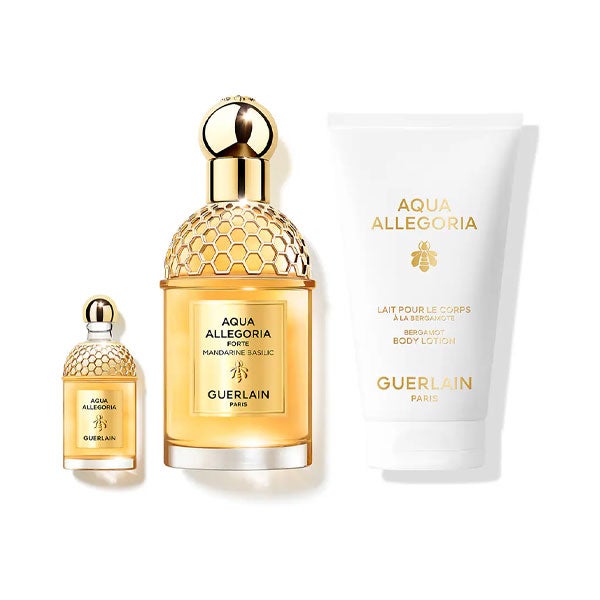 El cofre de regalo Eau de Parfum Aqua Allegoria Forte Mandarine Basilic de Guerlain contiene el Eau de Parfum Aqua Allegoria Mandarine Basilic Forte, una fragancia que une la chispeante esencia de la mandarina dorada con la frescura aromática de la albahaca, realzada por matices cálidos de madera de sándalo y un delicado fondo avainillado. Además, incluye una loción corporal con aroma a bergamota, evocando la energía de las bergamotas calabresas. Su estuche se distingue por una presentación exclusiva con inspiración Art Nouveau, diseñada por Mélissandre Vidal en homenaje a la naturaleza. Guerlain apuesta por un enfoque de sostenibilidad mediante un diseño circular que incorpora un neceser reutilizable y materiales reciclables.
