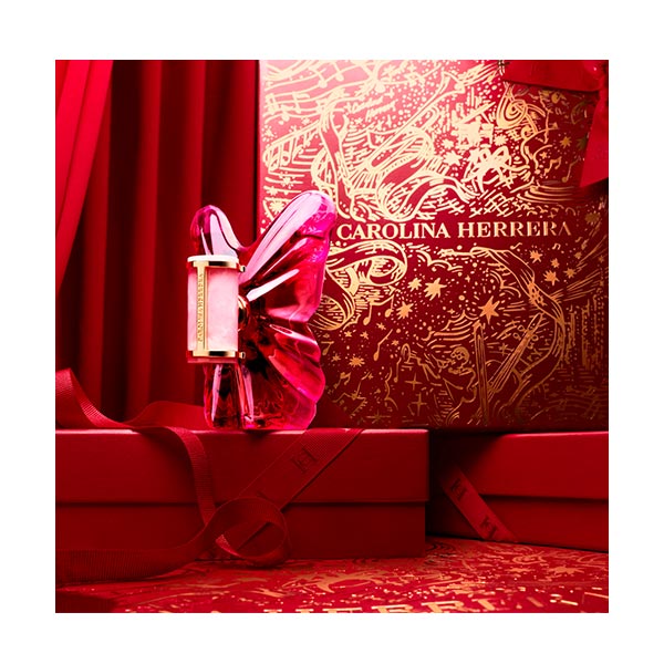El set de regalo de tres piezas incluye La Bomba Eau de Parfum (80 ml), Mega Spritzer (10 ml) y Loción Corporal (100 ml), una crema ligera y nutritiva que impregna la piel con la cautivadora esencia de La Bomba.