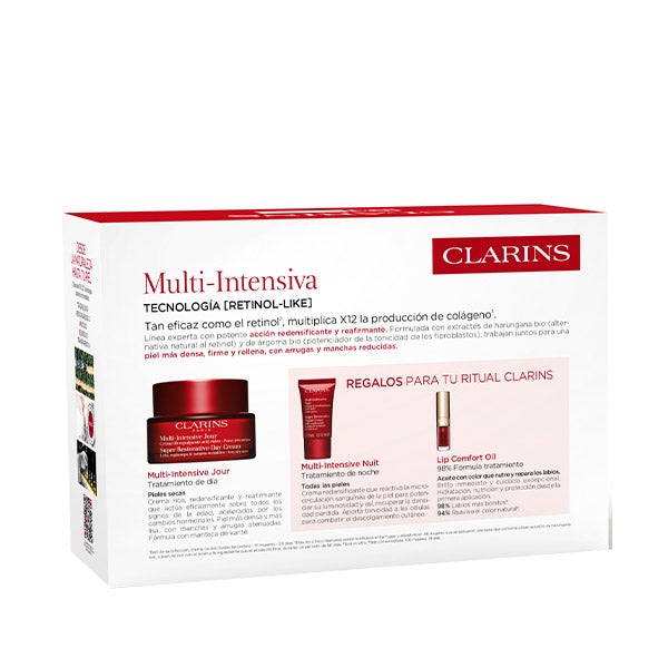 El Cofre Experto Otoño 2025 Multi-Intensiva Pieles Secas de Clarins incorpora la innovadora tecnología [Retinol-Like] de origen vegetal, que impulsa la síntesis de colágeno ayudando a redensificar y tonificar la piel, mientras atenúa las arrugas marcadas y las manchas. Contiene Multi-Intensive Jour Pieles Secas 50 ml, una crema de día nutritiva que aporta firmeza, confort y elasticidad a las pieles secas; Multi-Intensive Nuit 15 ml, un tratamiento nocturno que regenera intensamente y devuelve la consistencia al rostro al despertar, y Lip Perfector 5 ml, un embellecedor labial que hidrata, repara y ofrece brillo con un efecto voluminoso natural.