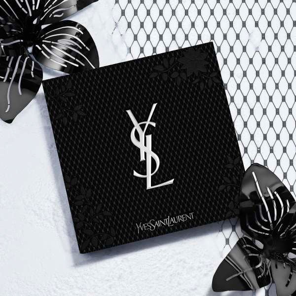 El cofre se presenta en un sofisticado color negro sobre una textura inspirada en la alta costura. La flor de edelweiss de Yves Saint Laurent actúa como broche distintivo que adorna este lujoso estuche festivo.