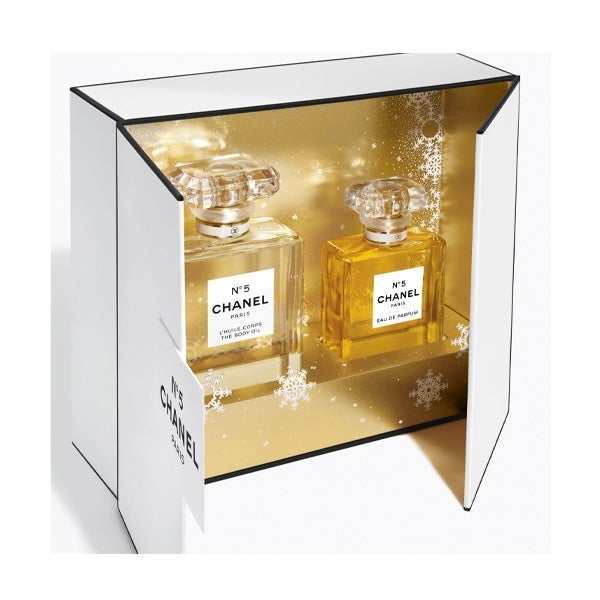 En esta temporada festiva, los emblemáticos copos de nieve de CHANEL engalanan los obsequios, transformándolos en piezas excepcionales. N°5 Eau de Parfum y N°5 Aceite corporal proponen un ritual aromático exquisito con su inconfundible estela floral aldehídica, reunidos en un estuche de edición limitada decorado con los distintivos copos de nieve. En su interior se incluye el N°5 Aceite para el cuerpo en un formato exclusivo que evoca las líneas refinadas del icónico frasco de N°5.