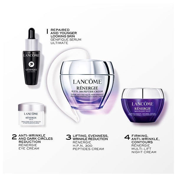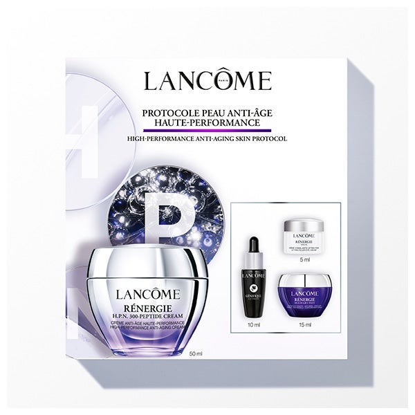 Un conjunto de tratamiento facial que incluye una rutina diaria y nocturna completa con sérum, crema para el contorno de ojos y cremas de día y noche, diseñado para ayudar a que la piel se regenere con mayor rapidez que su proceso de envejecimiento. Este elegante cofre de regalo reúne tus esenciales de belleza preferidos: - Rénergie H.P.N. 300-Peptide Cream 50ml - Rénergie Crema Contorno de Ojos 5ml - Sérum Génifique Ultimate 10ml - Rénergie Multi-Lift Crema de Noche 15ml