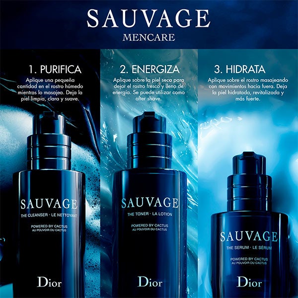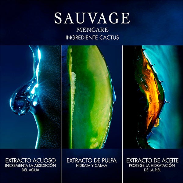 La loción Sauvage contribuye a reducir los signos de cansancio, suaviza las molestias posteriores al afeitado y proporciona una sensación inmediata de frescor gracias a su fórmula con extracto acuoso de cactus.