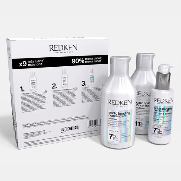 Este cofre de Redken combina champú, acondicionador y sérum reparador pertenecientes a la línea Acidic Bonding Concentrate. Su fórmula con complejo fortalecedor de enlaces y pH ácido está diseñada para restaurar la estructura capilar desde el interior, ofreciendo un cuidado profesional que repara, fortalece y protege el cabello dañado o sensibilizado.