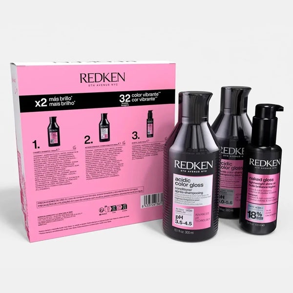 Este set de REDKEN incluye el champú, acondicionador y tratamiento sin enjuague de la gama Acidic Color Gloss, creados para realzar la luminosidad y conservar la intensidad del color del cabello. Gracias a su fórmula con Acidic Shine Complex y Tecnología de pH Avanzada, contribuye a sellar la cutícula y a fijar el brillo, ofreciendo un color intenso y duradero, con acabado de salón desde casa. Al seguir la rutina completa, el cabello logra un aspecto hasta un 76% más radiante.