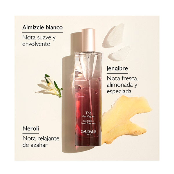 Los tratamientos corporales Thé des Vignes están inspirados en la sensualidad del Agua Fresca Thé des Vignes, creada en 2011 por Mathilde Thomas, fundadora de Caudalie, junto al maestro perfumista Jacques Cavallier.