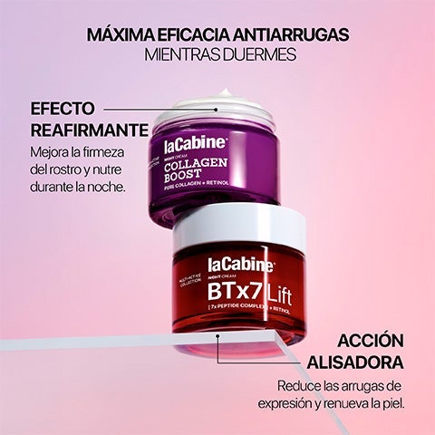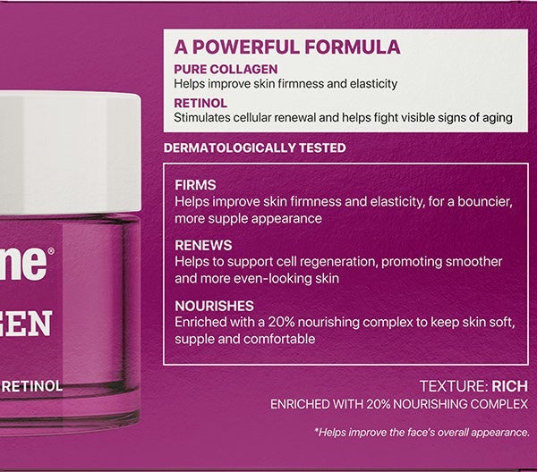 Tratamiento nocturno reafirmante y nutritivo, formulado con colágeno puro y retinol encapsulado.