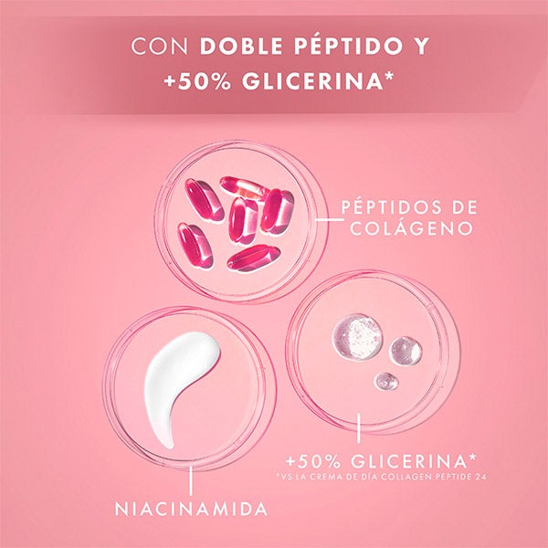 Tras 14 días de uso, el 88% de las mujeres nota la piel más suave y confortable. Este suero, formulado con niacinamida pura al 99%, la máxima concentración de péptido de colágeno de Olay y un 50% más* de agentes hidratantes, mejora la apariencia de firmeza y suavidad del rostro. *Comparado con el sérum Collagen Peptide.