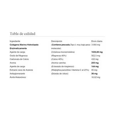 Complemento alimenticio a base de colágeno, plantas, minerales y ácido hialurónico.Los complementos alimenticios no deben utilizarse como sustitutivos de una dieta equilibrada. No superar la dosis diaria expresamente recomendada. Mantener fuera del alcance de los niños más pequeños.