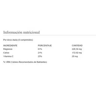 - Con Magnesio: La dosis diaria de 6 comprimidos, aporta un 61% de Magnesio. El Magnesio es un mineral esencial que, entre otras funciones, contribuye al mantenimiento de los huesos y músculos en condiciones normales, así como a la síntesis proteica normal.