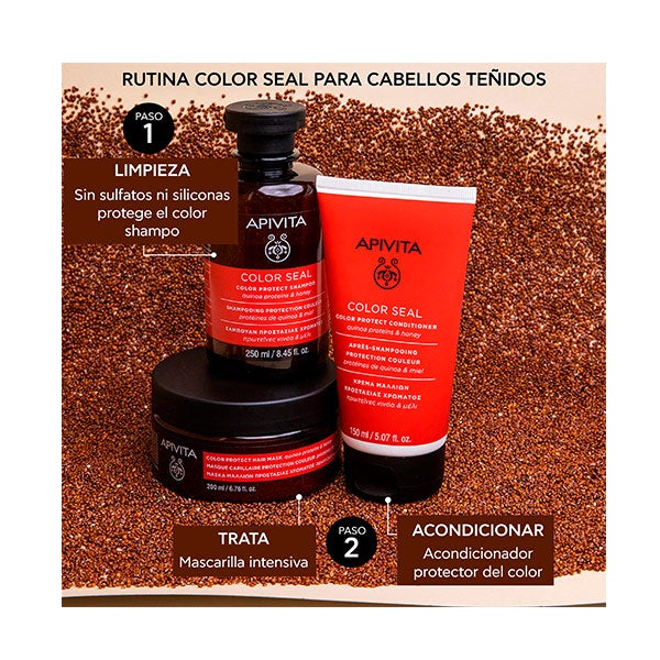 Su fórmula incluye proteínas de quinoa y un agente sellador del color que favorecen la luminosidad del cabello teñido.