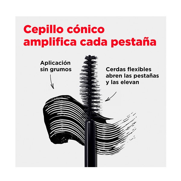 Su aplicador cónico con fibras suaves potencia cada pestaña, ofreciendo un efecto alargador comparable a extensiones y una definición que se mantiene hasta 24 horas.