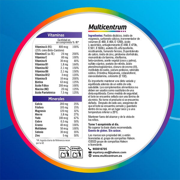 Fosfato dicálcico, óxido de magnesio,carbonato cálcico, incrementador de volumen (E 460, E 464, E 1200), ácido L- ascórbico, antiaglomerante (E468, E470b, E 551, E 553b) acetato DL-alfa tocoferilo, nicotinamida, fumarato ferroso, D- pantotenato de calcio, óxido de zinc, piridoxina dorhidrato, mononitrato de tiamina, riboflavina, beta-caroteno, aceite vegetal (coco y palma) sulfato cúprico, acetato de retinilo, ácido pteroilmonoglutáminico, cloruro de cromo, moliodato de sodio, yoduro potásico, seleniato sódico, D- biotina, filoquinona, colecalciferol, cianocobalamina, colorante (E 132)