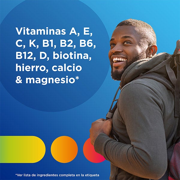 Suplemento nutricional con vitaminas y minerales diseñado para hombres mayores de 18 años. Contribuye al correcto desempeño del sistema inmunitario y favorece el bienestar muscular gracias a su aporte equilibrado de micronutrientes.
