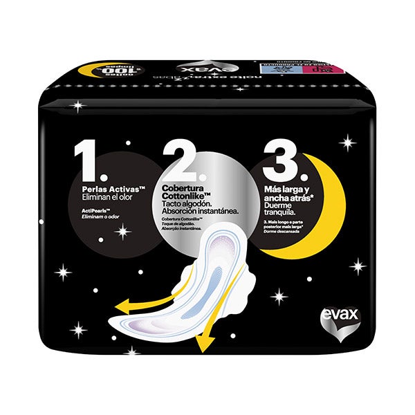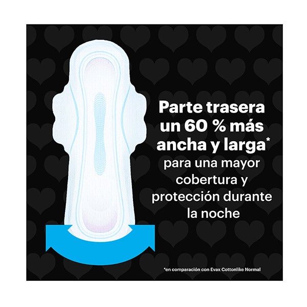 Evax Cottonlike Noche Extra, 10 unidades, son compresas ultrafinas diseñadas con una zona trasera un 60 % más amplia y alargada que la de las compresas diurnas, proporcionando una protección continua durante toda la noche.