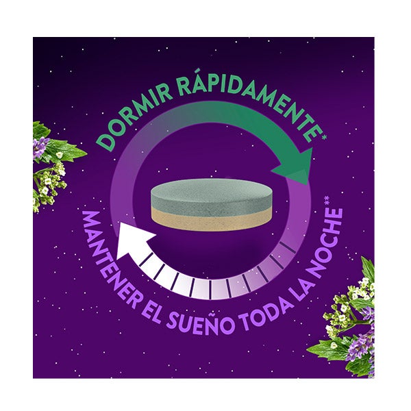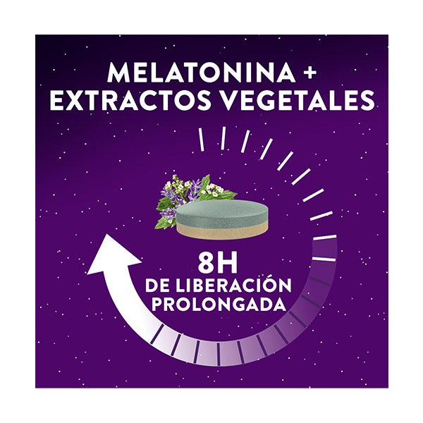 Agente De Carga: Celulosa Microcristalina; Extracto De Raíz De Valeriana (Valeriana Officinalis L.); Extracto De Hojas De Melisa (Melissa Officinalis L.); Agente De Carga: Hidroxipropilmetilcelulosa; Extracto De Partes Aéreas De Amapola De California (Eschscholzia Californica Cham.); Agente De Carga: Hidroxipropilcelulosa; Agente De Recubrimiento: Hidroxipropilmetilcelulosa; Antiaglomerante: Sales De Magnesio De Ácidos Grasos; Agente De Recubrimiento: Hidroxipropilcelulosa; Colorante Alimentario: Espirulina (Spirulina Platensis) Y Manzana (Malus Domestica); Agente De Carga: Croscarmelosa Sódica; Colorante Alimentario: Cártamo (Carthamus Tinctorius L.) Y Limón (Citrus Lemon) (Contiene: Jarabe De Sacarosa, Maltodextrina Y Ácido Cítrico); Melatonina; Vitamina B6 (Clorhidrato De Piridoxina); Antiaglomerante: Dióxido De Silicio. Ingredientes Por 1 Comprimido: Vitamina B6: 1,4 mg (Ingesta De Referencia: 100 %); Extracto De Valeriana: 160 mg; Extracto De Melisa: 80 mg; Extracto De Amapola De California: 40 mg; Melatonina: 1,9 mg