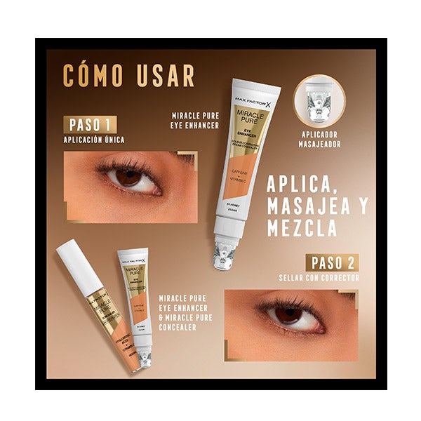 Experimenta el poder del Miracle Pure eye enhancer de Max Factor, un tratamiento iluminador y corrector antifatiga que combate la apariencia de ojeras. Su fórmula combina cuidado de la piel con Cafeína y Vitamina C, aportando una mirada más radiante.