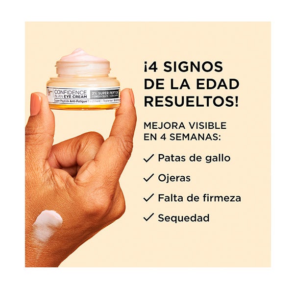 La zona del contorno de ojos requiere una atención específica para minimizar los efectos del paso del tiempo. Confidence in an Eye Cream es la fórmula ligera antiedad de siempre, ¡ahora renovada con un 2 % de Super Peptide Concentrate para abordar los 4 signos visibles de cansancio ocular! En tan solo 4 semanas notarás una mejora significativa en: