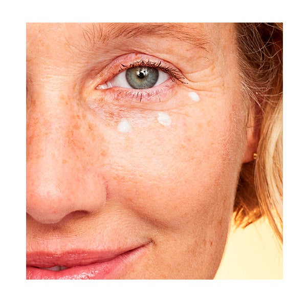 - Con la yema del dedo anular, distribuir suavemente una pequeña cantidad (del tamaño de un guisante) desde la parte interna hasta la externa del contorno de ojos.