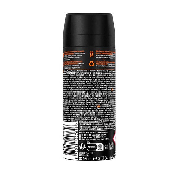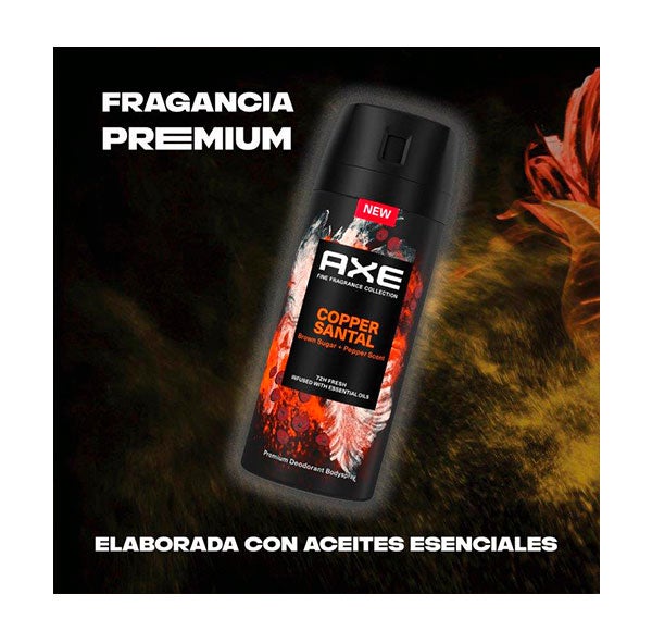 Desodorante en aerosol para hombre Axe Copper Santal Fragancia Premium 150ml AXE Fine Fragrance Collection es nuestra nueva gama de Bodyspray premium, enfocada en el hombre moderno con una vida social activa que busca una mayor eficacia. Disfruta de 72 horas de frescor gracias a nuestra fórmula mejorada sin sales de aluminio y con 2X más tecnología Zinc que nuestro Bodyspray estándar, para lograr una mayor protección contra el mal olor y mantenerte fresco durante más tiempo. FRAGANCIA PREMIUM ELABORADA CON ACEITES ESENCIALES El desodorante en aerosol para hombre Axe Copper Santal combina la suavidad aromática del sándalo y el azúcar moreno con un toque especiado de pimienta negra picante para darte una sensación cálida y sublime. Toques de gamuza y cardamomo que se funden con notas cítricas y la riqueza del café para crear una fragancia profunda.+ Características principales: - Disfruta de 72 horas de frescor y huele irresistible con nuestra nueva gama de bodyspray premium - Fragancia premium elaborada con aceites esenciales que combina sándalo y azúcar moreno con un toque de pimienta negra picante para darte una sensación cálida y sublime - Mantente fresco a otro nivel. Fórmula sin sales de aluminio - Con 2X más tecnología Zinc que nuestro Bodyspray estándar para darte una mayor protección contra el mal olor Aplicación: Vaporizar manteniendo el bodyspray a 15cm de tu piel Advertencias: No aplicar sobre la piel lesionada. Dejar de usar si se produce irritación. Evitar una vaporización prolongada. Proteger de la luz del sol. No exponer a temperaturas superiores a 50ºC. Mantener fuera del alcance de los niños. Lata elaborada con aluminio reciclable.