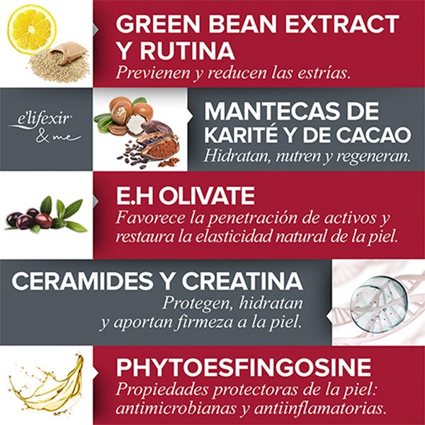 Elifexir Crema Estrías embarazo actúa frente a los tres factores responsables de su formación, disminuyendo la profundidad de las estrías y suavizando su tono rosado y la textura irregular de la piel.
