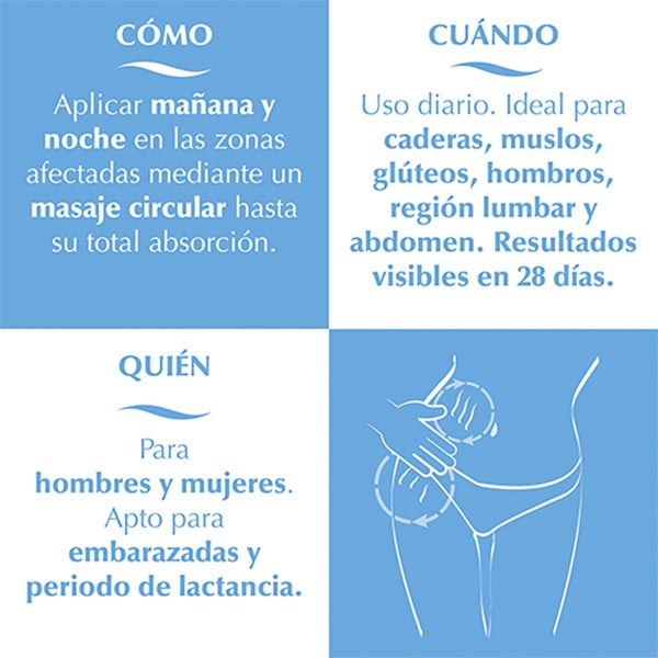 Aplicar por la mañana y por la noche sobre las áreas a tratar, realizando un suave masaje circular hasta que la crema se absorba completamente.