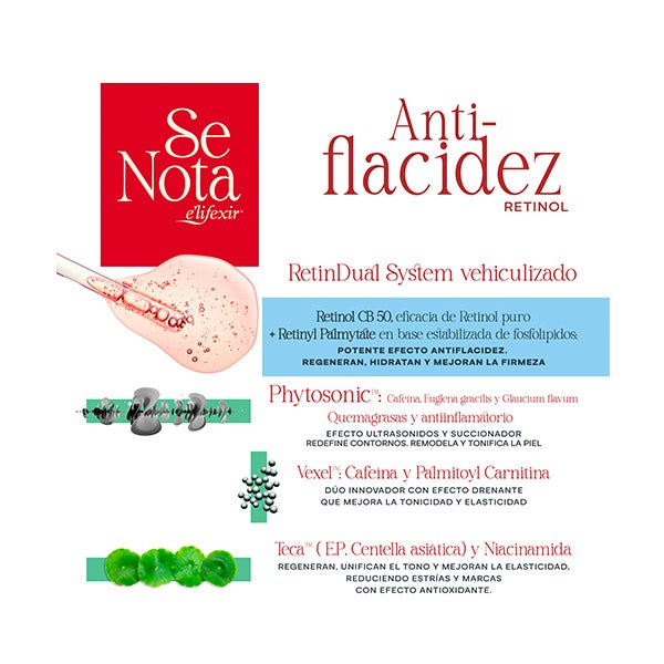 Elifexir Retinol Anti-Flacidez es un innovador cremigel corporal reafirmante que redefine la piel gracias a su tecnología RetinDual System, una fórmula revolucionaria que combina Retinol CB 50 y Retinyl Palmytate en una base estabilizada con fosfolípidos para una acción óptima.