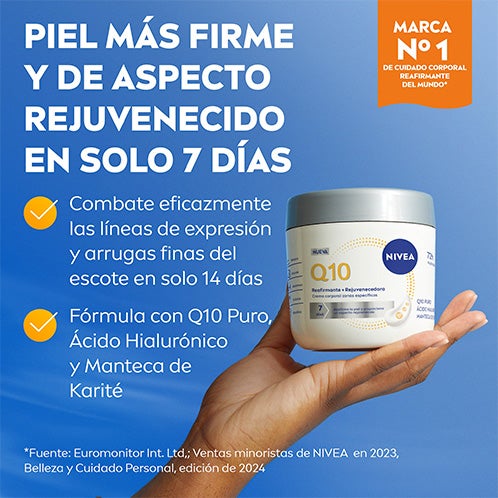 NIVEA Q10 Crema Corporal Reafirmante y Rejuvenecedora especialmente formulada para tratar áreas concretas del cuerpo, combina Q10 puro con Ácido Hialurónico. En tan solo 7 días ayuda a mejorar la firmeza de la piel en zonas que requieren mayor cuidado como brazos, abdomen, glúteos o rodillas. En 14 días contribuye a reducir visiblemente las líneas y pequeñas arrugas del escote, con eficacia comprobada. Su textura cremosa con manteca de karité ofrece hidratación profunda hasta por 72 horas. Resultado: una piel visiblemente más tersa, suave, luminosa y con apariencia renovada. Aplicar realizando un masaje suave en las zonas deseadas hasta su completa absorción. Reafirma la piel y aporta un efecto rejuvenecido en una semana. Hidratación intensa por 72 horas. Contiene Q10 puro, ácido hialurónico y manteca de karité.