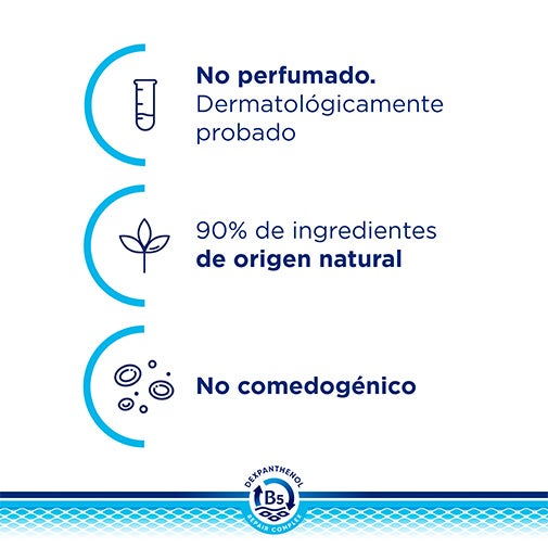 Contiene un 90% de ingredientes de origen natural. Su eficacia está clínicamente comprobada. Sin fragancia. No comedogénica.