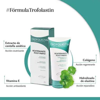 Composición y activos principalesEntre los ingredientes destacados de la Trofolastin Crema Reafirmante Postparto se encuentran: