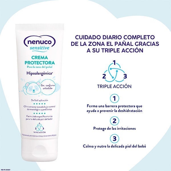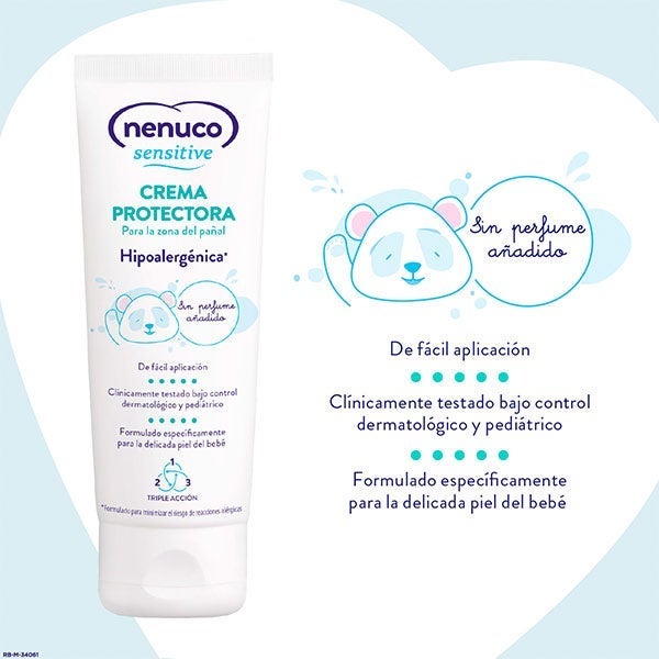 La Crema Protectora para el área del pañal de Nenuco Sensitive es hipoalergénica y ha sido creada especialmente para cuidar la piel sensible del bebé.