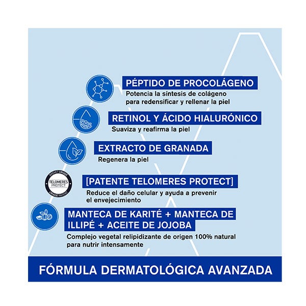 - Complejo patentado [TELOMERES PROTECT], que ayuda a minimizar el deterioro celular y protege del envejecimiento inducido por los rayos UV y la luz azul.