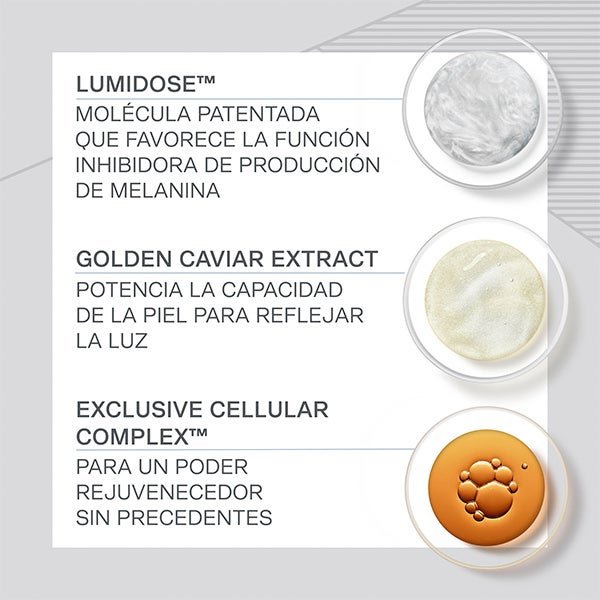 • El Extracto de Caviar dorado, de calidad superior y obtenido de fuentes sostenibles, contiene nutrientes que fortalecen la firmeza de la piel y refinan su textura, dejándola sedosa al tacto.