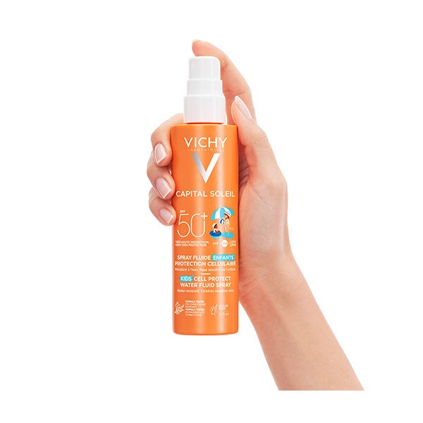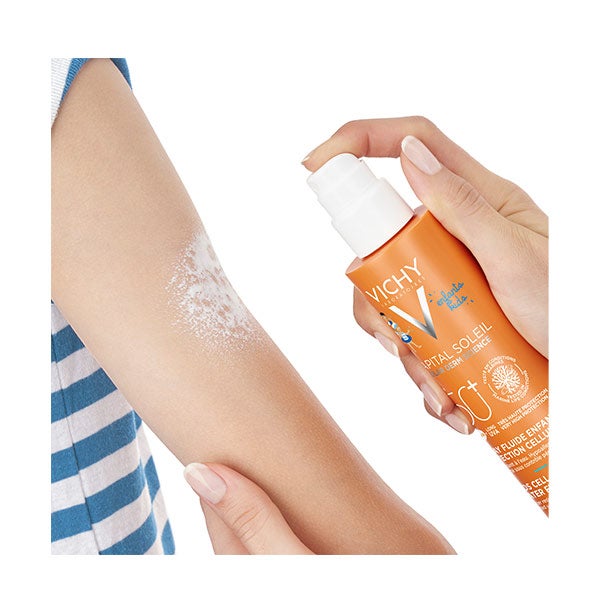 Kids Cell Protect Water Fluid Spray ayuda a resguardar la piel frente a los efectos nocivos del sol directamente en sus células cutáneas. SPF 50+
