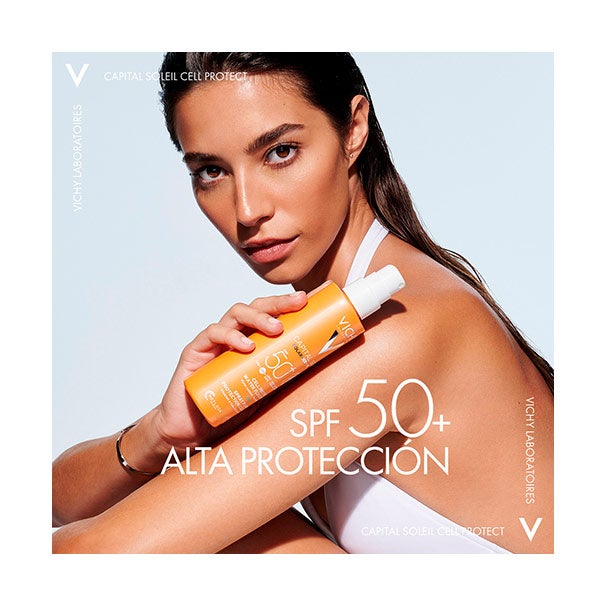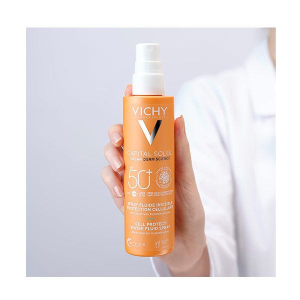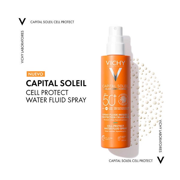 Cell Protect Water Fluid Spray SPF50 ofrece una defensa avanzada a 4 niveles (UVB, UVA, UVA largos y acción antioxidante) para ayudar a evitar los daños ocasionados por la exposición solar, incluso en las células cutáneas.