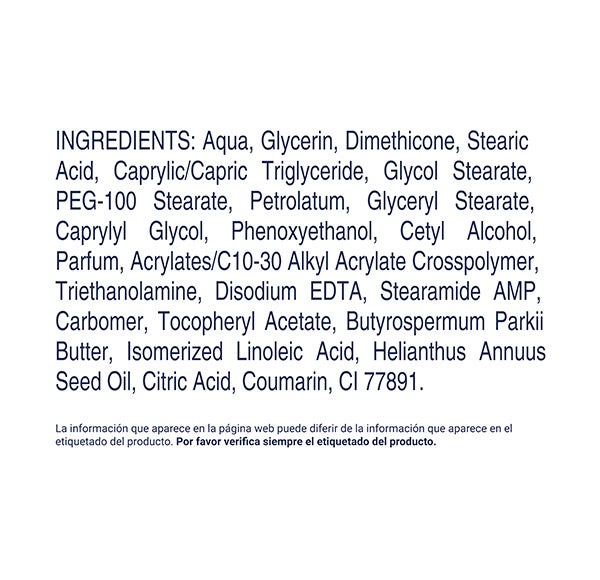 Aqua, Glycerin, Stearic Acid, Caprylic/Capric Triglyceride, Dimethicone, Glycol Stearate, PEG-100 Stearate, Petrolatum, Cyclopentasiloxane, Glyceryl stearate, Phenozyethanol, Cetyl Alcohol, Acrylates/C10-30 Alkyl Acrylate Crosspolymer, Parfum, Triethanolamine, Methylparaben, Butyrospermum Parkii, Propylparaben, Stearamide AMP, Disodium EDTA, Carbomer, Potassium lactate, Sodium PCA, Helianthus Annuus Seed Oil, Isomerized Linoleic Acid, Urea, Collagen Amino Acids, Lactic acid, CI 77891