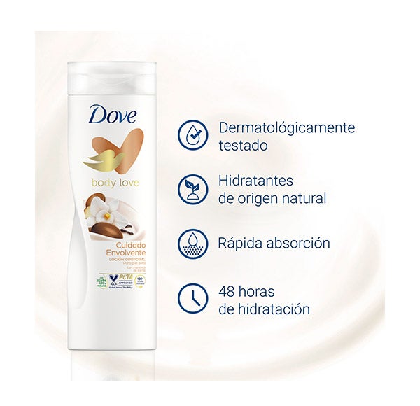 La loción corporal Dove Cuidado Envolvente de karité y vainilla hidrata intensamente y deja la piel increíblemente suave gracias a su exclusiva mezcla de crema nutritiva con manteca de karité.