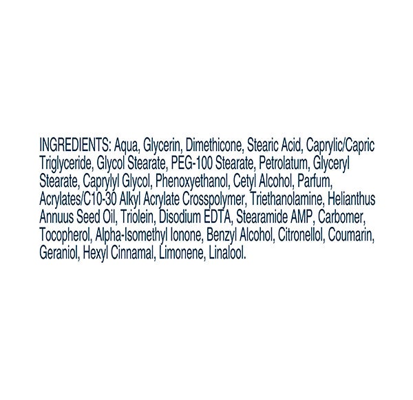 Aqua, Glycerin, Stearic Acid, Caprylic/Capric Triglyceride, Dimethicone, Glycol Stearate, PEG-100 Stearate, Cyclopentasiloxane, Petrolatum, Collagen Amino Acids, Helianthus Annuus Hybrid Oil, Isomerized Linoleic Acid, Lactic Acid, Potassium Lactate, Sodium PCA, Urea, Glyceryl Stearate, Stearamide AMP, Triethanolamine, Acrylates/C10-30 Alkyl Acrylate Crosspolymer, Carbomer, Cetyl Alcohol, Disodium EDTA, Parfum, Methylparaben, Phenoxyethanol, Propylparaben, Alpha-Isomethyl Ionone, Benzyl Alcohol, Butylphenyl Methylpropional, Citronellol, Coumarin, Geraniol, Hexyl Cinnamal, Hydroxyisohexyl 3-Cyclohexene Carboxaldehyde, Limonene, Linalool, CI 77891.