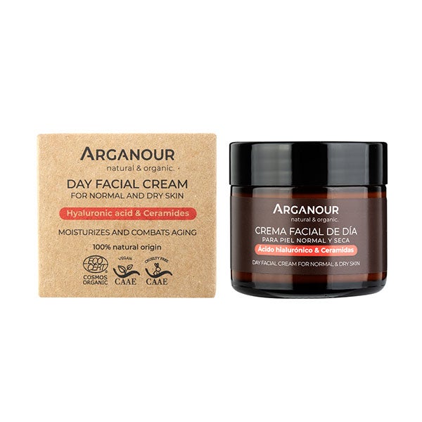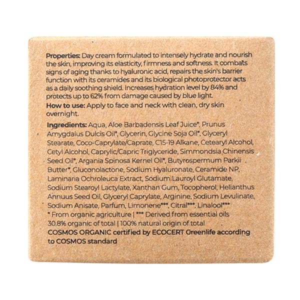 Crema facial de día elaborada con aceite de argán y almendras, manteca de Karité, Ácido Hialurónico y Colágeno.