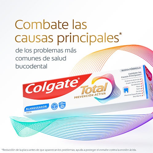 La salud de tu sonrisa comienza mucho antes de que surjan los problemas bucales. La fórmula renovada de Colgate Total Prevención Activa Blanqueadora ha sido creada científicamente para ofrecer una acción preventiva continua y combatir las causas principales* de los trastornos bucodentales más habituales³. Con una protección antibacteriana¹ de 24 horas comprobada clínicamente y un exclusivo sistema² que mantiene estable su ingrediente activo, garantiza un desempeño superior⁴. Es la opción ideal para resguardar tu sonrisa frente a futuros inconvenientes bucales. Además, su tecnología blanqueadora avanzada logra hasta un 35% menos de manchas superficiales⁵, ayudando a que tus dientes luzcan más blancos.