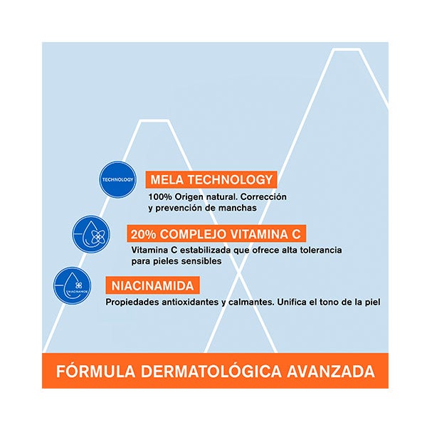 Principios activos dermatológicos: [Mela Technology + 20% Complejo Vitamina C* + Niacinamida]