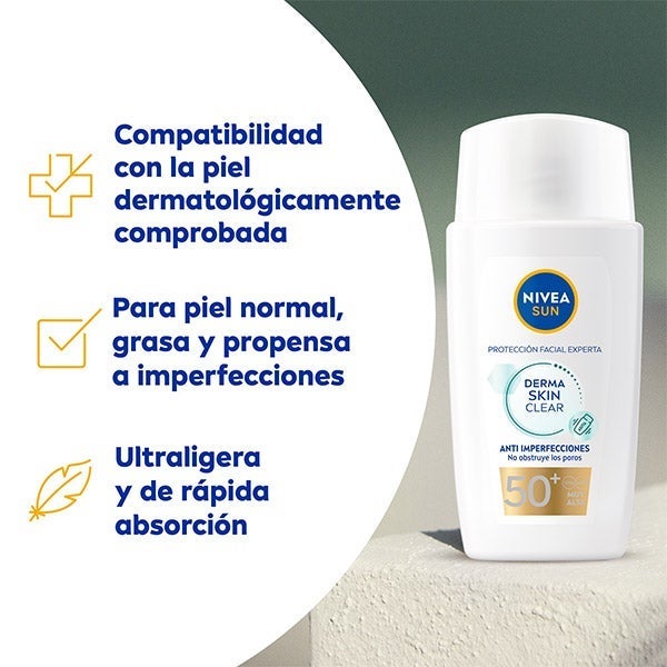 El Fluido Facial Derma Skin Clear FP50+ de NIVEA SUN es una loción facial muy ligera creada para cuidar la piel normal, grasa o propensa a las imperfecciones, incluso si es sensible. Este fluido solar ofrece protección externa frente a los rayos UVA/UVB y la Luz Visible de Alta Energía, ayudando a evitar el envejecimiento prematuro de la piel. El Licocalcón A, un antioxidante natural presente en su fórmula, refuerza las defensas de la piel desde el interior, resguardando las células frente al daño oxidativo. Gracias a su textura no grasa y de absorción rápida, combina un complejo anti-imperfecciones con Niacinamida que controla el exceso de sebo y contribuye a prevenir nuevas imperfecciones. Es no comedogénico, con tolerancia cutánea clínicamente probada, y cuenta con una fórmula respetuosa con los océanos.